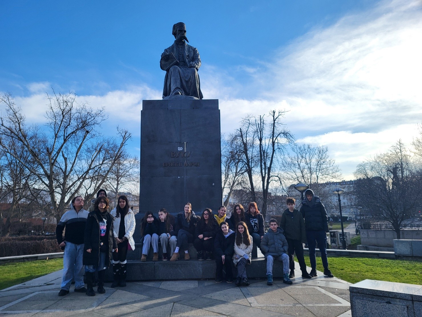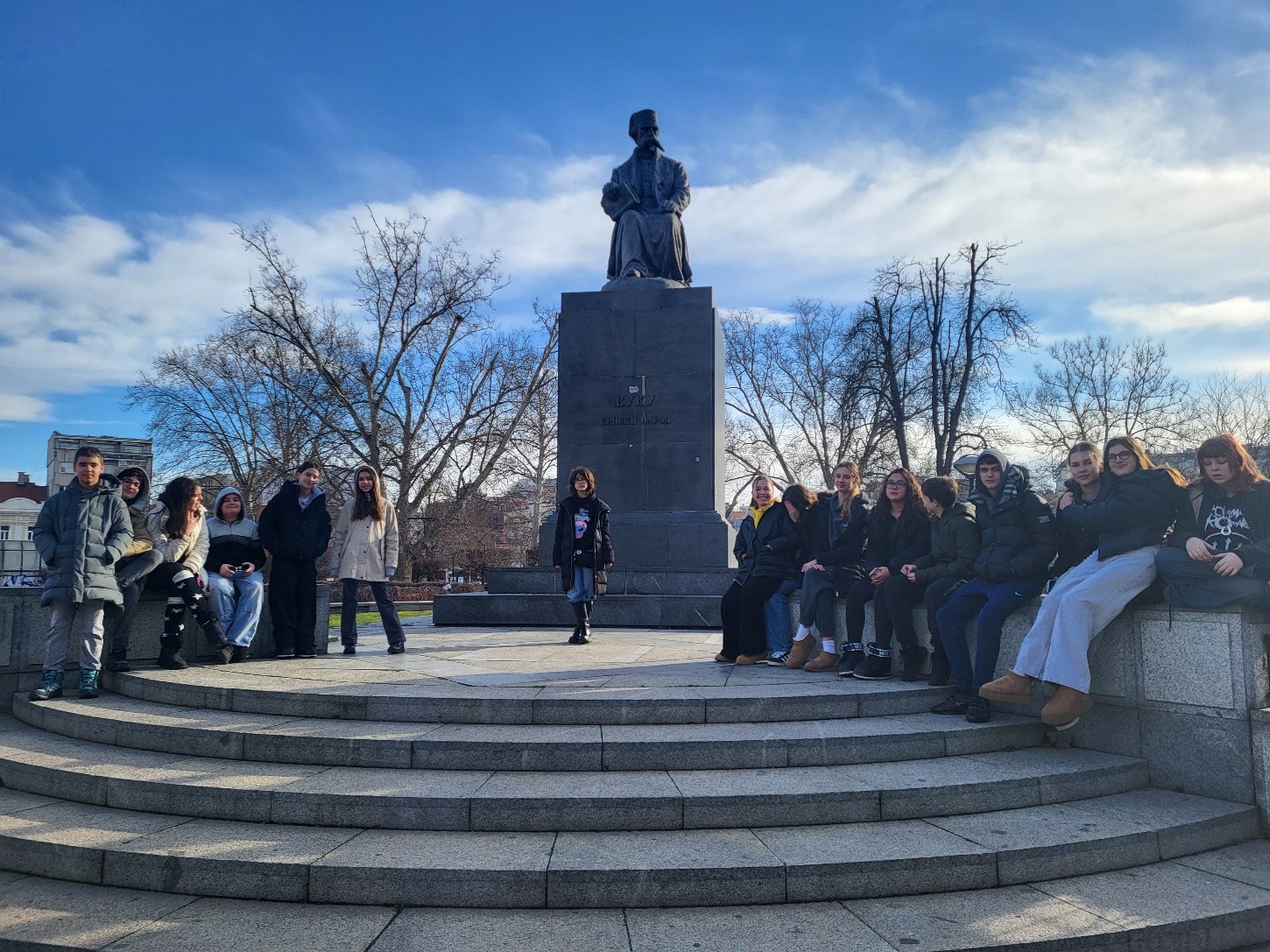 У оквиру пројекта "Правимо се Енглези" ученици одељења 7-5 су обишли споменик Вуку Караџићу. Ученица Ана Добријевић нам је причала о овој знаменитости на енглеском језику, а остали ученици су постављали питања и коментарисали сам споменик као уметничко дело.